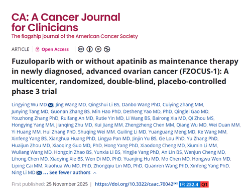 2025年11月25日,AG百家乐医药自主研发的创新药氟唑帕利联合阿帕替尼或氟唑帕利单药用于新诊断晚期卵巢癌(OC)的一线维持治疗研究最新数据(FZOCUS-1研究)重磅在线发表于国际顶尖医学期刊《临床医师癌症杂志》(A Cancer Journal for Clinicians,简称CA,2024年影响因子高达232.4)1